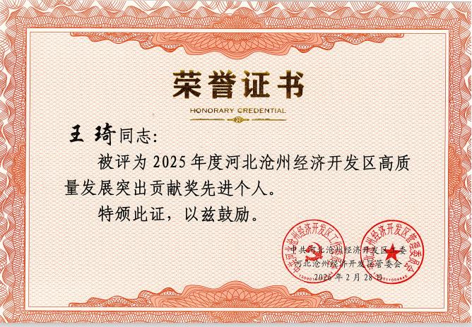 喜报|王琦荣获沧州经济开发区2025年度高质量发展突出贡献奖先进个人