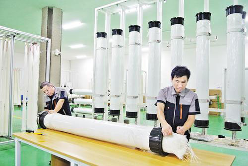 8月20日,海派特膜科技(河北)有限公司工人在生产车间组装柱式膜组件。 本组图片由本报记者王雅楠摄